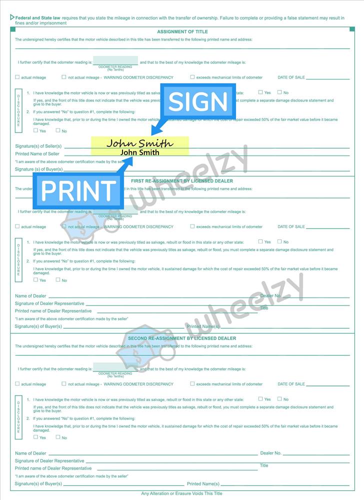 2. Back of the title right below where you signed your name(s) - print name(s) on the line where it reads "Printed Name of Seller(s)."