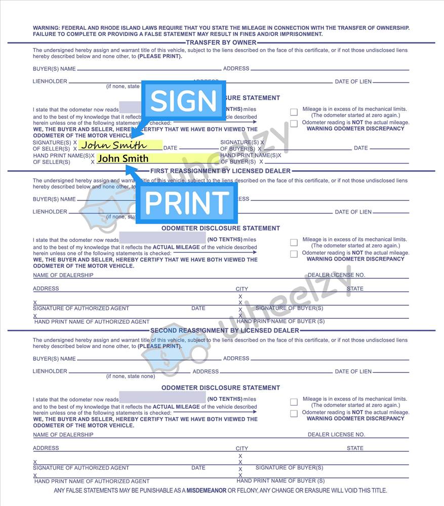 Be sure to write clearly and sign/print your name exactly as spelled on the front of your title. Avoid white-out, scribbles, and strike-throughs.