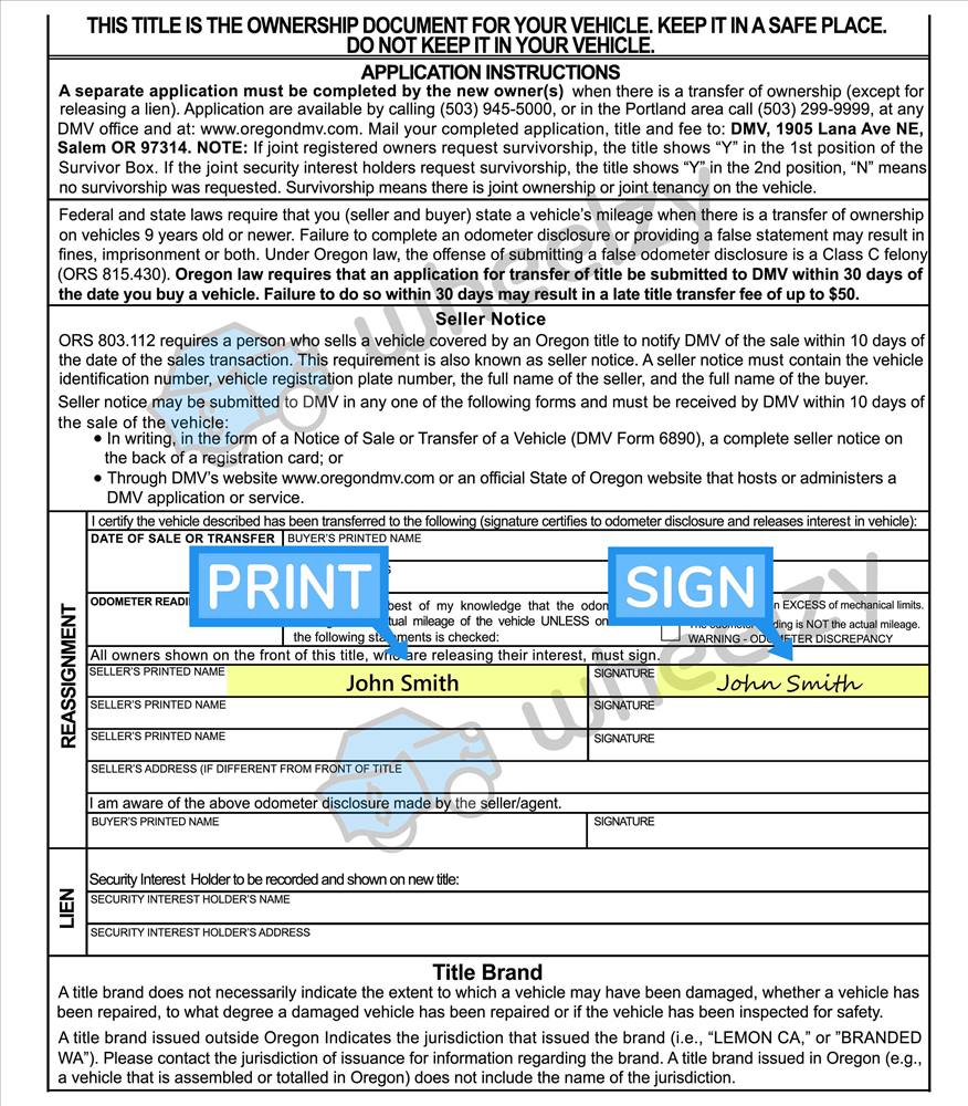 - Back of the title bottom half - print name(s) in the box where it reads "Seller's Printed Name."