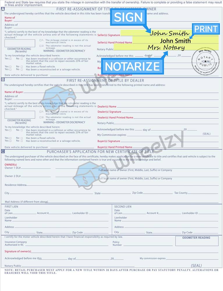 If your North Carolina title shows a lien or a bank name printed on the front, then your title will need to be signed off by the lien holder or have a separate lien release letter.