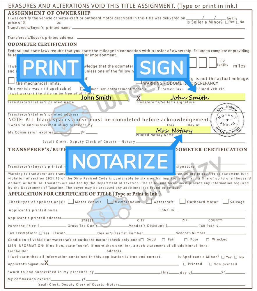 - Back of the title top half - print your name on the line that reads "Seller's Printed Name."